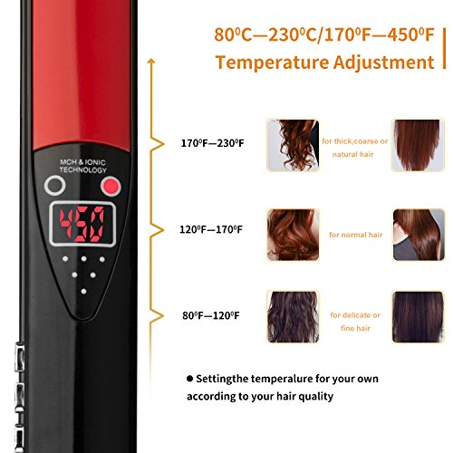 - ❤Free Adjustment, rapid heating, 30 files temperature control, rapid prototyping, arbitrary, give you a better experience. Start between 265 F - 300 F for delicate or fine hair types, 300 F - 380 F for normal hair, and 380 F - 470 F for thick or coarse hair types