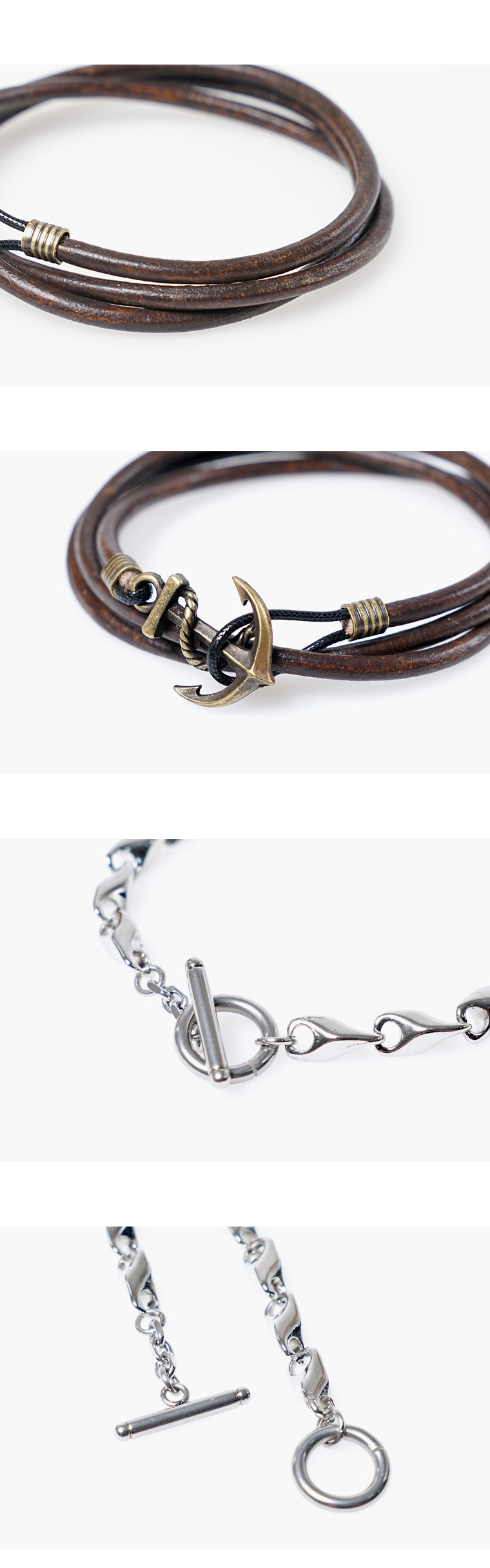 3mm 통가죽 스트링을 사용해 심플하게 제작한 가죽팔찌와 고급스러우면서도 심플한 디자인이 매력적인 체인팔찌로 이루어진 팔찌세트입니다. 부드러운 수입가죽을 사용해 착용감이 좋고, 부담없는 굵기로 가볍게 착용하기 좋습니다. 심플하면서도 자연스럽게 레이어드 된 듯한 디자인이 매력적입니다. 시계나 다른 팔찌와 레이어드용 팔찌로 사용하셔도 잘 어울립니다. 체이팔찌는 유니크한 느낌의 체인디자인이 포인트로 단품으로 착용시에도 충분히 존재감을 나타낼 수 있습니다. 변색과 알러지에 강한 써지컬스틸로 제작된 체인과 장식을 사용해서 오래도록 내구성 좋게 착용하기 좋습니다. 댄디한 코디에 심플하게 포인트로 착용하거나, 가죽이나 원석으로 만들어진 팔찌와 함께 착용해도 좋습니다. 남녀 모두 착용하기 좋은 디자인으로 사이즈는 남성용, 여성용, 주문제작이 가능합니다.