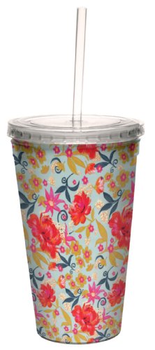 Tree-Free Greetings cc33719 Aqua Floral Pattern by Nel Whatmore Artful Traveler Double-Walled Cool Cup with Reusable Straw, 16-Ounce