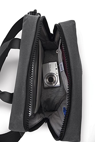 -. Feature : Unique poly canvas cross body bag with a look and feel that gets better with use; six anti-theft features built in for peace of mind, and internal organization for all daily essentials / RFIDsafe blocking material built into a pocket in the main compartment helps protect IDs and credit cards from hacker scanning; padded iPad/tablet sleeve / Roobar Locking System to secure interlocking zippers, add optional padlock for additional security (sold separately) / Lightweight, hidden eXomesh Slashguard stainless steel wire mesh embedded into fabric helps protect against slash-and-run theft / 9.1x4x11.9