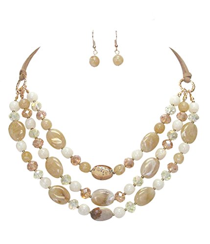 -. Feature : 18 inch translucent white, translucent, marbled beige and natural-color faux-stone acrylic and glass bead three-strand layered look necklace with beige aurora borealis iridescent glass bead accents on faux-suede. An additional 3 inches of wearable length is available via extender chain. / Necklace is a mix of translucent, transparent and opaque beads with tiny gold-tone spacer beads and all gold-tone findings. / Depth of drop at the front of the necklace measures approximately 2 inches (see second photo). / Matching dangle drop earrings measure 1 ¼ inches in length as measured from the top of the ear wire and 3/8 inch at their widest points. / Due to the nature of this design, there may be minor variations in color and shape of beads from one set to the next.