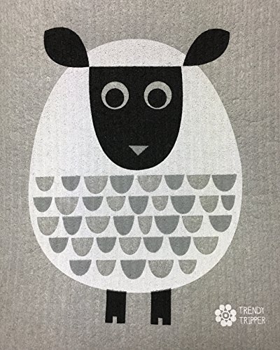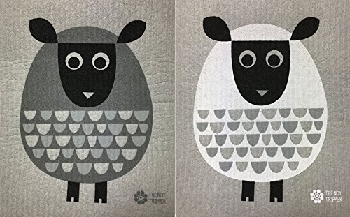 Swedish Dishcloths, Set of 2 Different Colored MODERN SHEEP on Grey Cloth: 1 each White + Dark Grey