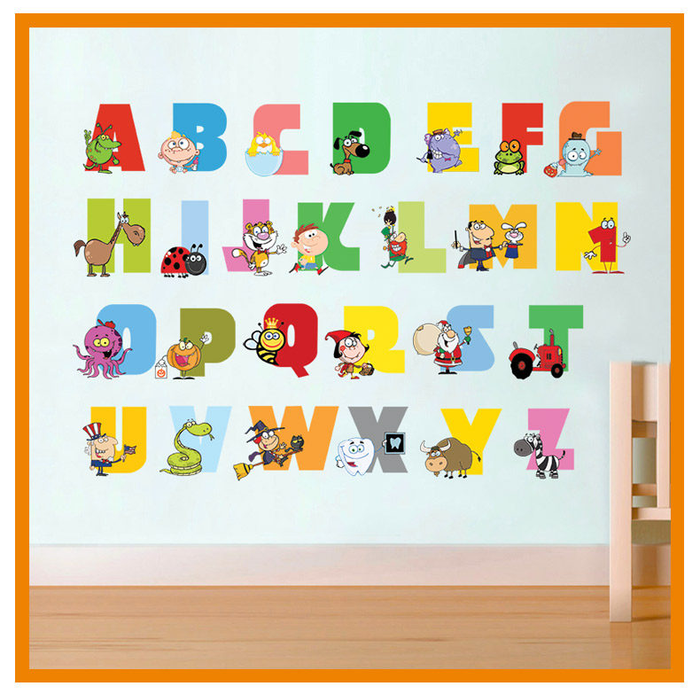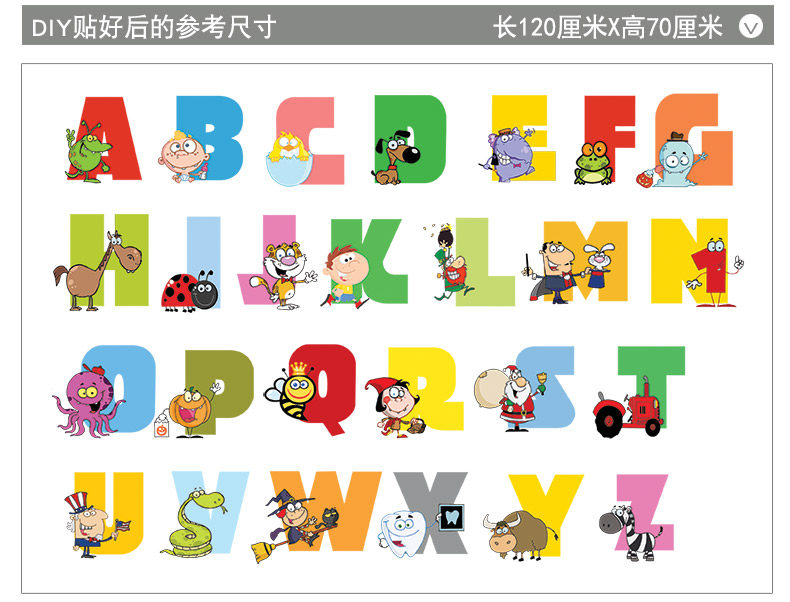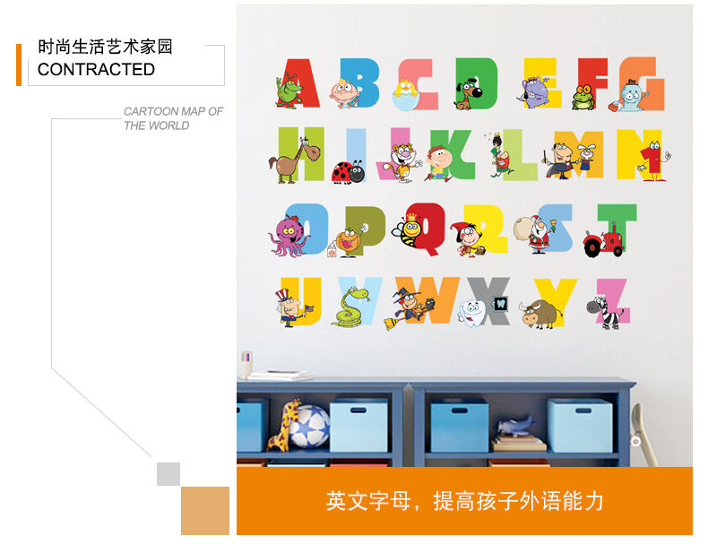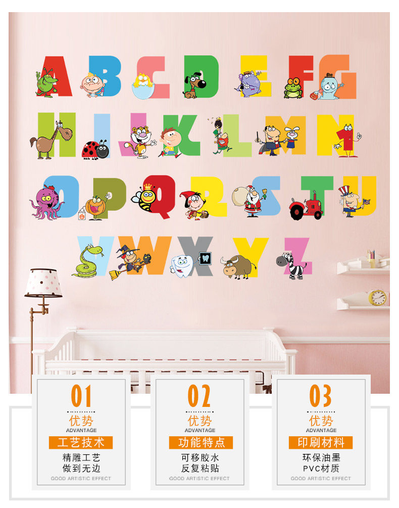 卡通动物英文字母表贴画趣味贴纸儿童房装饰品幼儿园教室布置自粘