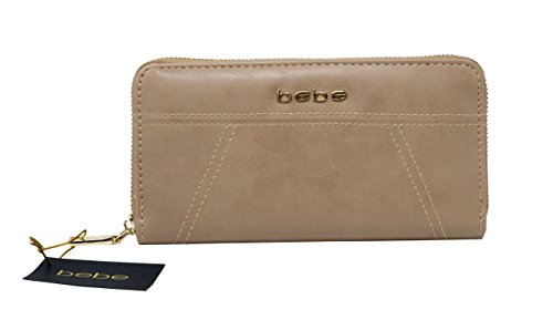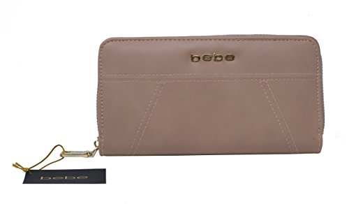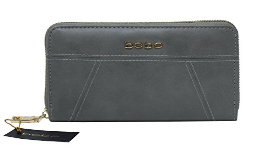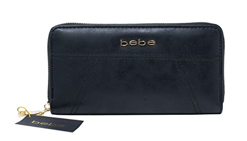 Black exterior with the Bebe logo name in gold. The interior opens to 8 credit card slots, a zipper pocket, and 4 larger slip pockets. Measurements: Approximately 7 1/2 "W x 4"H. Tag Information: Evelyn Zip Around US:1SZ WBE10-231 BlackFeature