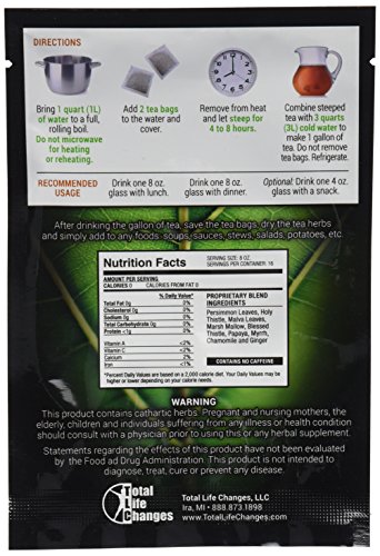-. Binding : Grocery -. Brand : Total Life Changes -. Feature : Powered by Dr. Miller's Holy Tea formula / May be benificial for weight loss, detoxifying, and stomach distress. / Comes with 4 sachet (8 tea bags) for 1 month supply / Persimmon Leaves, Holy Thistle, Malva Leaves, Marsh Mallow, Blessed Thistle, Papaya, Ginger, Chamomile, Myrrh -. IsAdultProduct : 0 -. Label : Total Life Changes -. LegalDisclaimer : IasoTM Tea is a flavored tea obtained from all natural sources. It's formulated to cleanse your intestines and detoxify your entire body.WEIGHT LOSS DETOXIFYING of chemicals, parasites, bacteria and toxins STOMACH DISTRESS including constipation, indigestion, acid reflux bloating and more. -. Manufacturer : Total Life Changes -. NumberOfItems : 1 -. PackageQuantity : 1 -. ProductGroup : Grocery -. ProductTypeName : GROCERY -. Publisher : Total Life Changes -. Size : 8 Ounces -. Studio : Total Life Changes -. Title : Iaso Tea