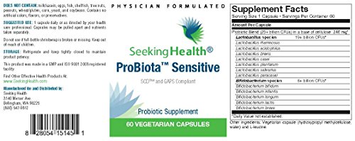 Seeking Health's ProBiota Sensitive is a broad-spectrum, multi-species probiotic that provides 12 certified lactobacillus and bifidobacterium species for optimum gastrointestinal and immune health.* The potent probiotics deliver 25+ billion CFUs in every capsule. Once absorbed, the probiotics help to establish and maintain a balanced, healthy intestinal microflora count, which supports healthy energy levels and a strong immune system.* Our potent probiotics provide a healthy balance microflora to support normal colonic motility, optimize digestion, facilitate elimination of gut toxins, and regulate healthy inflammatory processes.* Probiota Sensitive is a non-dairy probiotic, which is a great choice for those with sensitive digestive systems or food sensitivities. Additionally, our probiotic capsules are free of common allergens making it a great probiotic supplement for those with immune problems.* Seeking Health's digestive probiotic supports normal digestive functioning and may help relieve occasional stomach cramping, bloating, and skin inflammation.* Our probiotics are a great choice for anyone looking to improve their overall digestive health.Feature