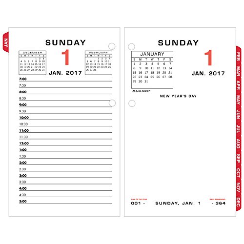 -. Binding : Office Product -. Brand : At-A-Glance -. EAN : 0038576247277 -. Feature : Daily refill will help you stay up-to-date and organized. Covers 12 months from January - December keeping you on track over a full year. Julian dates / Two pages per day. Left hand page includes half-hourly appointments from 7:00 a.m. - 5:00 p. m. Right hand page is unruled and provides general note taking space. Past, current and future months reference assist planning and scheduling / Dates and tabs are red to add a pop of color / Fits standard 17 Style bases (sold separatey) with 2 rings. Includes monthly tabs making it easy to reference any month quickly / 3.5 in. x 6 in. page size. 3.75 in. x 6 in. x 1.25 in. overall size -. Label : ACCO Brands -. Manufacturer : ACCO Brands -. Model : E01750-17 -. MPN : E01750-17 -. NumberOfItems : 1 -. PackageQuantity : 1 -. PartNumber : E01750-17 -. ProductGroup : Office Product -. ProductTypeName : OFFICE_PRODUCTS -. Publisher : ACCO Brands -. Studio : ACCO Brands -. Title : AT-A-GLANCE Daily Calendar 2017 Refill, 3-1/2 x 6", Desk Size (E017-50) -. UPC : 038576247277