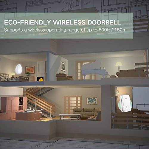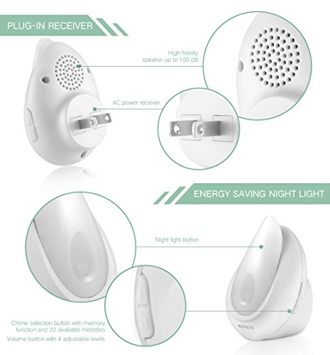 RELIABLE FUNCTIONS - Widespread operating range of over 500 feet (1000 feet in open area). 32 melodies with 4 levels of adjustable volume from 10dB to 100 dB. Advanced code-pairing technology.
