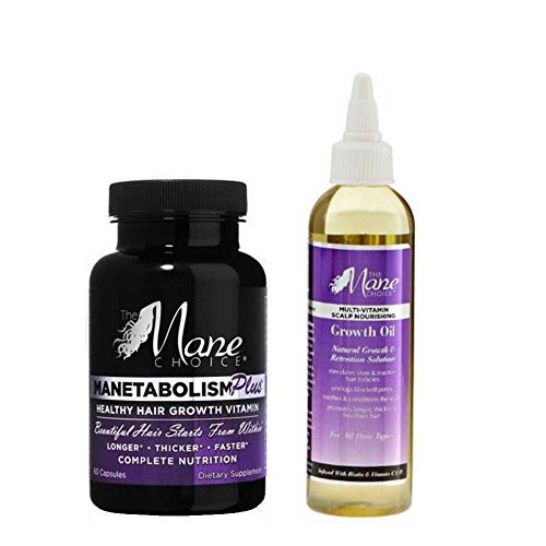 The Mane Choice Multi-Vitamin Scalp Nourishing Growth Oil is a natural growth stimulating oil made exclusively for the scalp.Manetabolism Plus is a specially formulated vitamin that aids in promoting healthy hair, nails and skin by supplying nourishment to the body's cells and by directly targeting hair follicles, nail beds and skin layers.In addition, it also boosts energy levels and helps to strengthen the immune system. Directions: For adults, take two (2) capsules daily as a dietary supplement.Feature