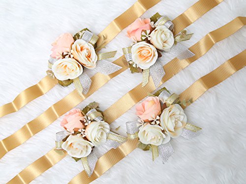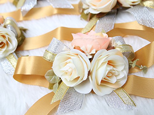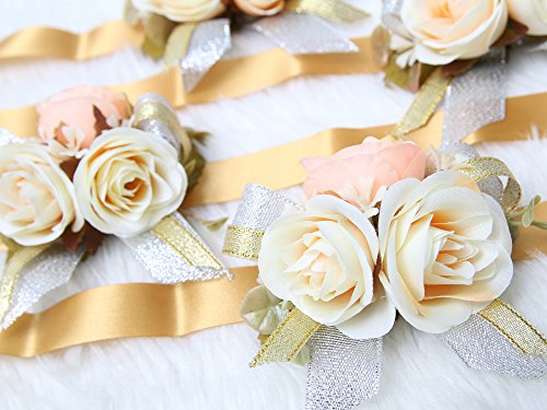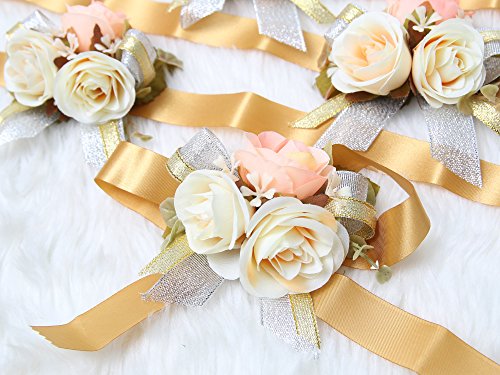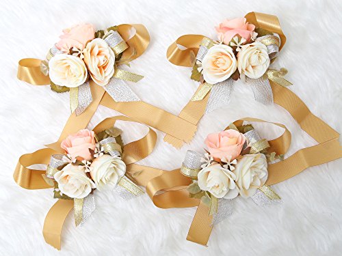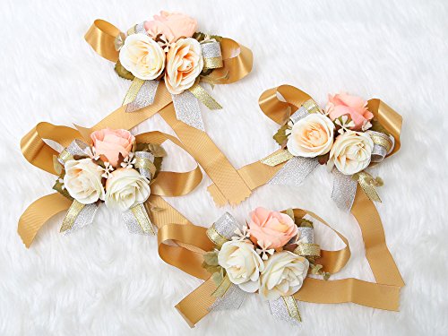 Gorgeous wrist corsage flowers for Wedding Bridal Bridesmaid Ceremony (Pack of 4)(Gold Theme)