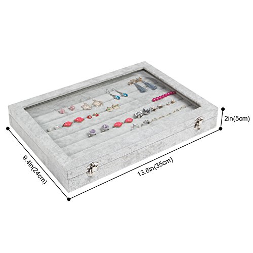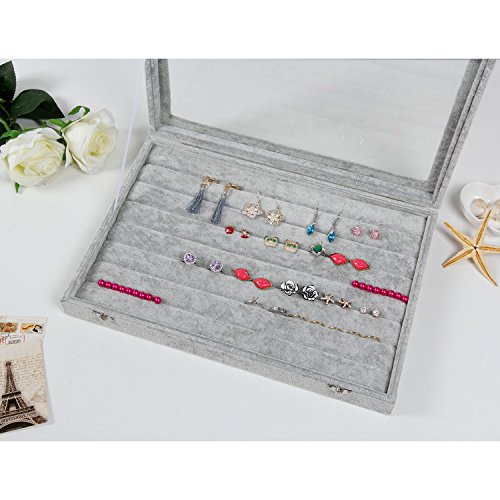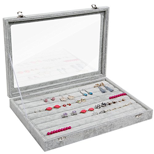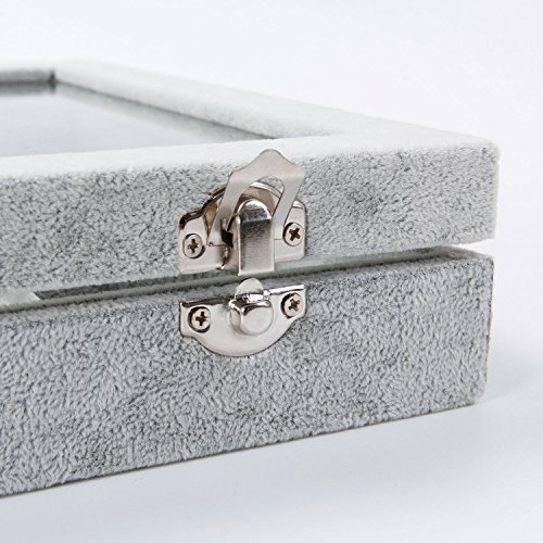 💍DURABLE CONSTRUCTION: Constructed with sturdy composite board wrapped in premium velvet fabric with removable compartment dividers and a glass lid to organize and protect your jewelries and accessories.
