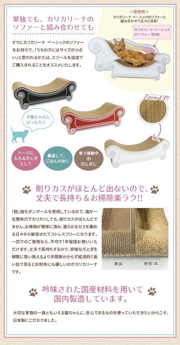 | スツール単独としてはもちろん、別売のカリカリーナのソファーと組み合わせても使える、便利なコンパクトサイズのスツールです。削りカスがほとんど出ない強化ダンボールを使用し、国内で製造しているので大切な家族の一員に安心してお使いいただけます。ゲージに入れる爪とぎや、車で移動中の爪とぎなどいろいろな用途に活用していただけます。子猫ちゃんにぴったり♪ |