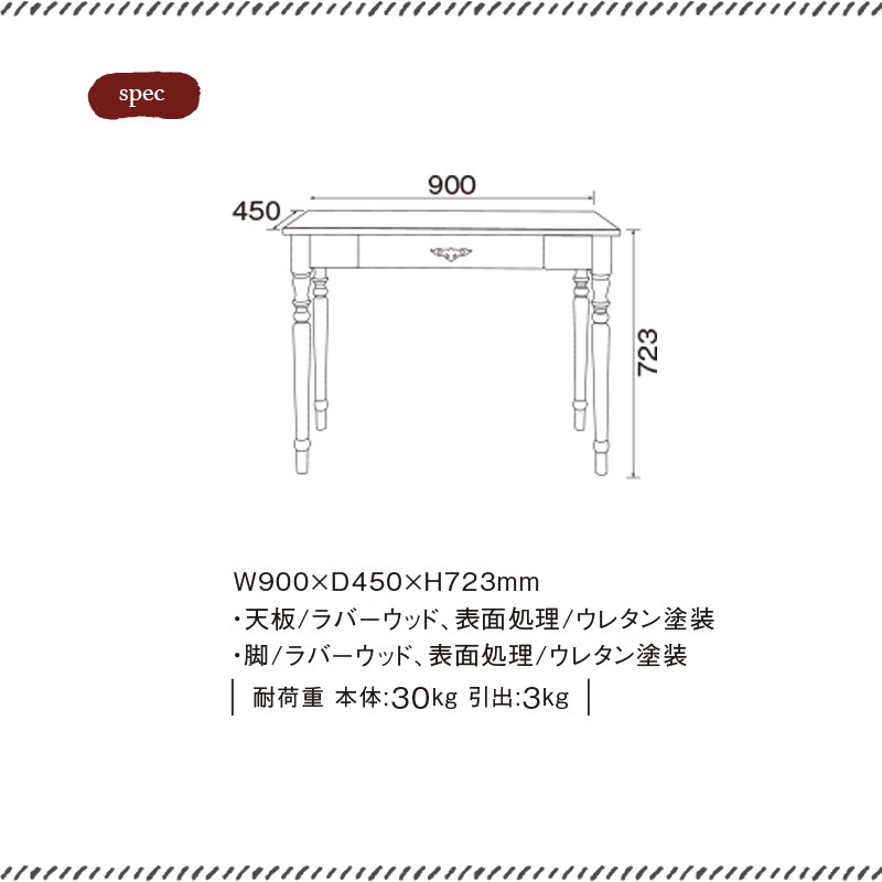 ◆商品説明◆かわいいだけじゃないのがちょうどいい!甘くなりすぎない私にぴったりの大人かわいいアイテムたち。耐荷重 本体:30kg 引出:3kg◆商品仕様◆サイズ(約)幅900×奥行450×高さ723材質:天板/ラバーウッド、表面処理/ウレタン塗装、脚/ラバーウッド、表面処理/ウレタン塗装カラー:ホワイトウォッシュ お届け仕様:お客様組立式◆注意事項◆白家具は長期間直射日光に当て過ぎると白が少しずつ黄変する恐れがありますので、高温多湿,直射日光を避けてご使用下さい。【こちらの商品はメーカー直送品です】※代引きでのお支払い不可※ご指定日受付不可とさせて頂きます。※在庫ありの場合は5日ほどで発送になります※在庫切れの場合いご連絡させていただきます。※同シリーズ以外の商品との同梱はできません。ご了承ください北海道、九州への発送は別途500円加算になりますご了承ください
