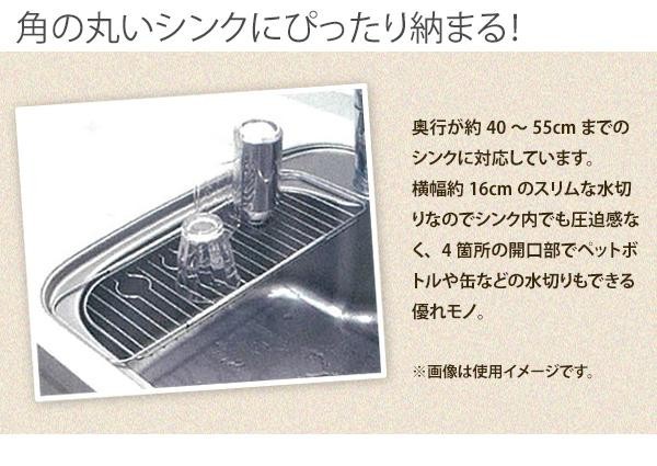 奥行が約40cmから55cmまでのシンクに対応。横幅約16cmのスリムな水切りなので、シンク内でも圧迫感なく4箇所の開口部で、ペットボトルや缶などの水切りもできる優れものです。 |