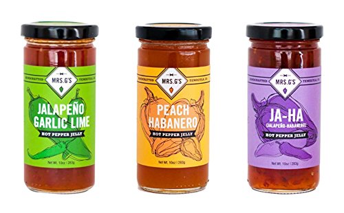 Mrs. G's HOT PEPPER JELLY 3-PACK: Jalapeno Garlic Lime, Peach Habanero and Jalapeno Habanero Jelly. Locally sourced and packaged in Southern California.