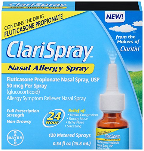 ClariSpray Nasal Allergy Spray works right in your nose to help block your allergic reaction at the source, and relieve the symptoms that make you uncomfortable: nasal congestion, runny nose, itchy nose, sneezing and itchy, watery eyes. ClariSpray Nasal Allergy Spray’s active ingredient, fluticasone propionate, is the #1 prescribed, clinically proven ingredient for nasal allergy relief. Nasal spray. For adults and children ages 4 . One spray contains 50mcg of fluticasone propionate. 0 |