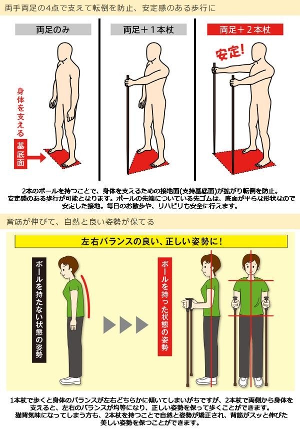 | 医療や介護の分野でも注目を集める、転倒を予防して歩く安心の2本杖。1本杖だと一方に偏ってしまう身体も、2本杖なら左右のバランスを保って歩く事ができ、背筋も伸びるので正しい姿勢で歩く訓練にも最適です。確実に固定できるボタン式機能を搭載!!長さは2cm毎・18段階での調整が可能です。 |