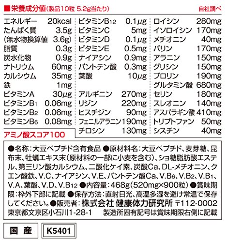 Peptide-like amino acid ● 3 per 10 tablets 500mg. Authentic amino acid food of amino acid score of 100. In soybean peptide derived from a plant amino acid score of 100. The essential amino acids that can not be synthesized in the human body it is possible to well-balanced supply. Vitamin 11 kinds needed for making the body plus the minerals (calcium iron). Because the tablet form you can easily nutrition without choosing a scene or location. Publisher manufacturer importer or distributor: There are individual differences for healthy physical fitness Institute ※ effect efficacy. If you disagree please stop using.