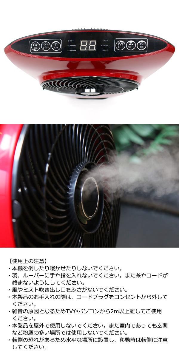 | エアコンの冷たい風が苦手な方にもオススメ!!細やかなミストを噴射して、それをサーキュレーターの風によって遠くまで幅広く拡散しながら気化冷却して涼しい風を送ります。夏はひんやり!!冬はうるおい!!一年中使える優れもの♪ |