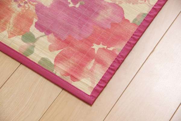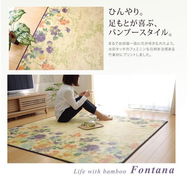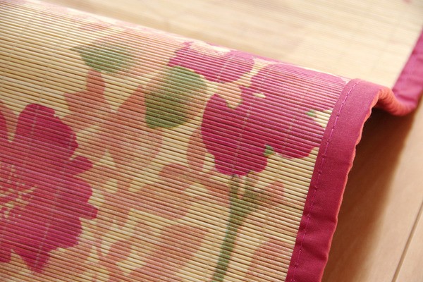 鮮やかな花柄をプリントしたバンブーラグです。竹の素材感をそのままに女性らしい色合いのデザインをプリントしました。竹は耐久性に優れ、熱伝導率が高いため自然のひんやり感があります。シンプルな糸無しの張り付けタイプです。また無垢材を使用し、あたたかみのある質感に仕上げました。竹は他の木材と比べると格段に成長が早く(3~5年で成竹)、持続的生産が可能な環境に優しいサスティナブルな素材です。
