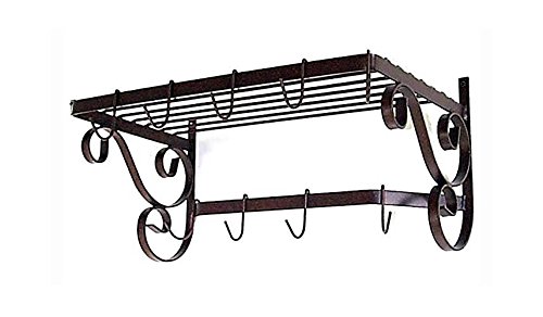 Studio : Grace Collection Publisher : Grace Collection Product Description You will love how this charming and decorative wall mounted pot rack adds style and extra storage space to your kitchen. Rack features 6 hooks on two levels, and top level features a grid shelf for extra hanging and storing of items such as cook books, your favorite bowls, or other decorative items. Includes ten (10) hooks and mounting hardware. Wall mounted. Made from wrought iron. Rectangular shape. 25 in. W x 13 in. D x 12 in. H (14 lbs.). 0.75 in. flat steel bar and curls for shelf. 0.19 in. cold rolled steel hanging hooks. Shelf for storage pots, books or other kitchen items on top. Adorned with French curls on sides. 0
