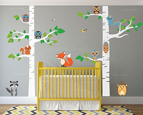 Birch Tree Wall Decal Forest with Owl Birds Squirrels Fox Porcupine Racoon Vinyl Sticker Woodland Children Decor Removable #1327 (96" (8ft) Tall, White Trees)