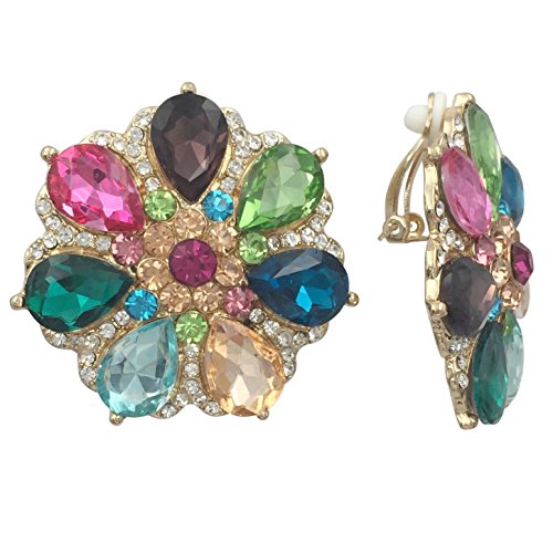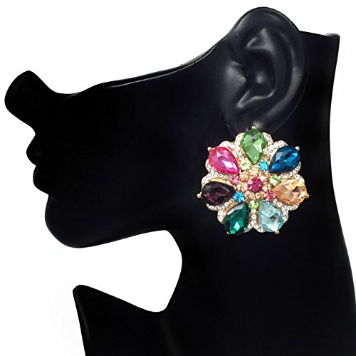 Large Flower Rhinestone BIG BLING Fancy Formal Prom Clip On Earrings (Multi Color Gold Tone)