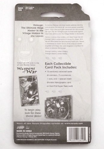 -. Brand : Bandai - Naruto -. EAN : 0700537348971 -. Feature : Lot of 24 Naruto TCG Weapons of War Booster Packs / There are 10 cards per pack: holographic foil card, rainbow stamped rare card, uncommon cards, common cards / Super rare holographic foil cards are inserted on average in every 1:6 booster packs / Ideal for set builders and all players alike -. Genre : Strategy -. IsAdultProduct : 0 -. ItemPartNumber : 24LotWeapons -. Label : Bandai - Naruto -. Manufacturer : Bandai - Naruto -. ProductGroup : Toy -. ProductTypeName : COLLECTIBLE_CARD -. Publisher : Bandai - Naruto -. Studio : Bandai - Naruto -. Title : Naruto TCG Weapons of War Booster Packs - Lot of 24 Blister Packaged Packs -. UPC : 700537348971