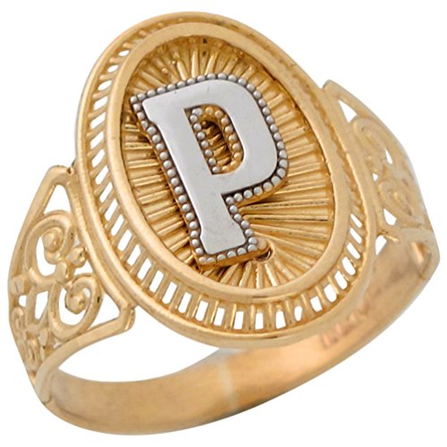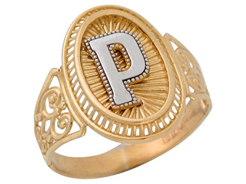 -. Binding : Jewelry -. Brand : Jewelry Liquidation -. Department : womens -. Feature : Made in USA! / Made with Real 14k Gold! / Comes with FREE fancy black leatherette ring box! -. ProductGroup : Jewelry -. ProductTypeName : FASHIONRING -. Title : 14k Two Tone Gold Letter P Filigree Band Radiant Ladies Oval Initial Ring
