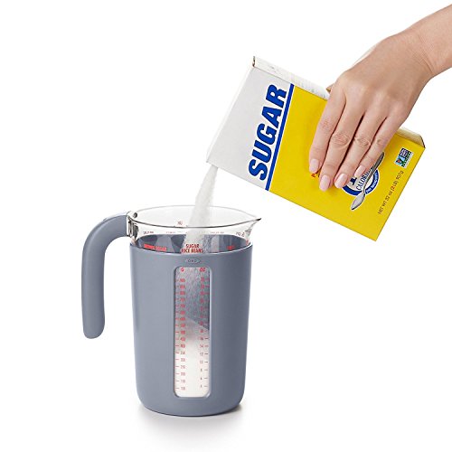 Makes it easy to measure an array of common ingredients, quickly with one vessel, with markings for: milk, oil, sugar, brown sugar, rice, oats, beans, water and flour