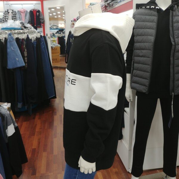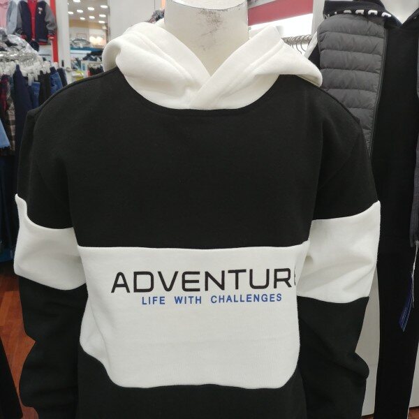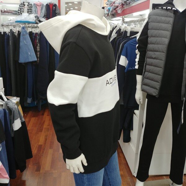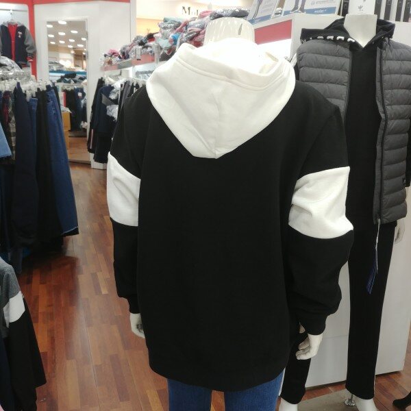 블랙과 화이트로 조합을 이룬 후드 티셔츠입니다.얇은 기모 원단으로 가을과 겨울 따뜻하게 보낼 수 있습니다.남녀공용입니다.