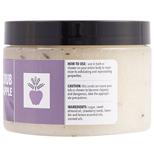 - WITH LAVENDER AND LEMON ESSENTIAL OILS – The Lavender Apple’s exfoliating body scrub contains pure lavender essential oils extracted from our own organically grown lavender plants on our farm in Cache Valley, Utah. The scrub also contains lemon essential oils, sweet almond oil, and strawberry seeds. You’ll love the clean, invigorating scent of this unique, natural blend of ingredients.
