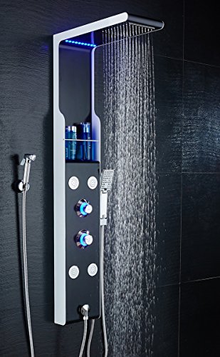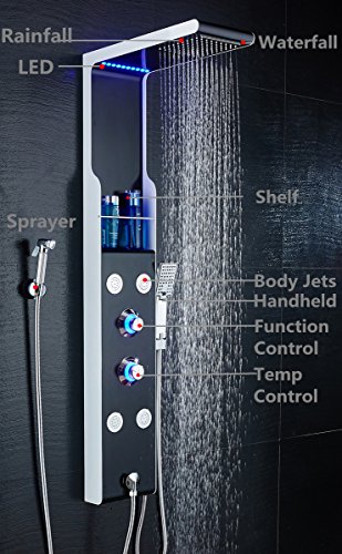 ELLO&ALLO Stainless Steel Shower Panel Tower System LED Rainfall Waterfall Shower Head 5-Function Faucet Rain Massage System with Body Jets Black and White