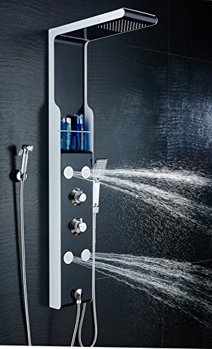 Shower panel has a rainfall waterfall shower head, bidet sprayer, a multi-functional 3-setting handheld shower head and body jets spray pattern. Plumbing components are included, super easy install.