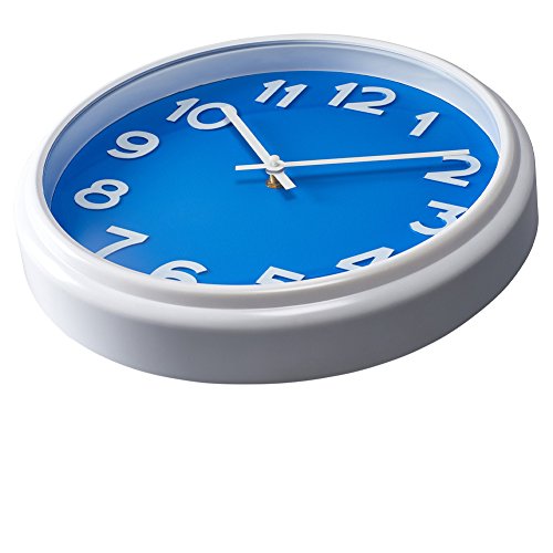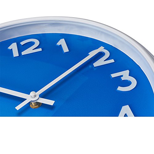 -. Feature : 12.5" White and blue wall clock. Large 3D numbers and to ensure easy viewing / New production with silent non-ticking, sweeping movement mechanism. Precise quartz movements to guarantee accurate time / Decorate and enhance your living room, bedroom, kitchen, office, classroom or nursery / Sturdy plastic case and glass lens makes it easy to clean and keeps dust away from dial / Uses 1 "AA" battery - not included. Large nail slot offers easy no-fuss and fast installation