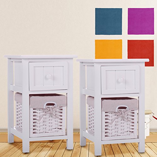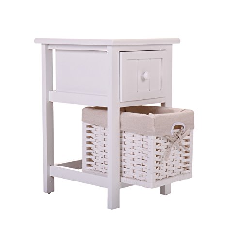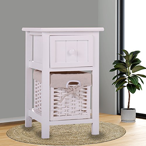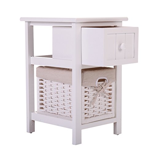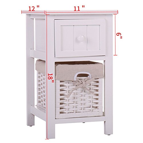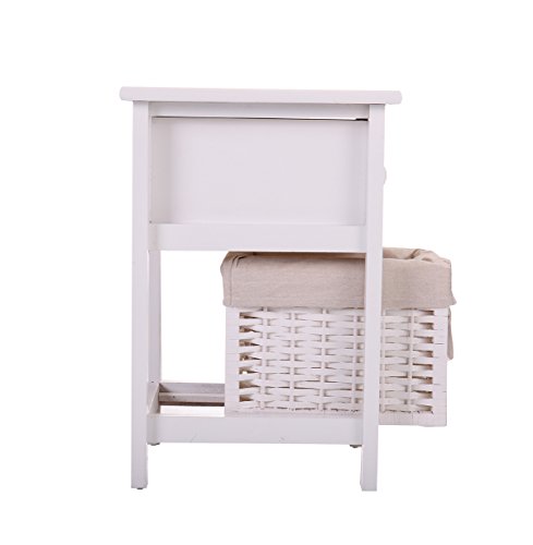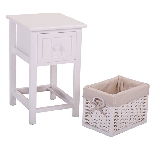 Description: This white nightstand is an easy addition to your bedroom decoration. With one drawer and one wicker basket, it is easy and convenient to storage small objects. Besides, this nightstand gives a feeling of elegance and sophistication wherever you are. Do not hesitate to buy one! Specifications: Color: White Material: Wood Single Overall dimension: 11"x12.2"x17.7" (L x W x H) Size of drawer: 7.5"x10.3"x5.3" (L x W x H) Size of basket: 7.1"x10.2"x7.4" (L x W x H) Product weight: 5.3 lbs Leg Height: 2" Max. Weight Capacity: about 160lbs Package Includes: 2 x Nightstand 1 x Screw kit 1 x Instruction 0