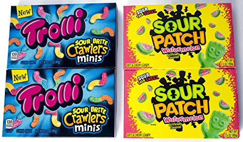 -. Feature : (2) 3.5oz Sour Patch Kids Watermelon / (2) 3.5oz Trolli Sour Brite Crawlers minis. / Sour Patch Kids are not your typical gummy candy. First they're sour. Then they're sweet. They are a fun, soft, and chewy candy for children and adults / Trolli Sour Brite Crawlers aren't the critters you were warned not to eat. They will amaze you with their sweet and sour taste / This bundle is a fun, soft, and chewy treat for children and adults