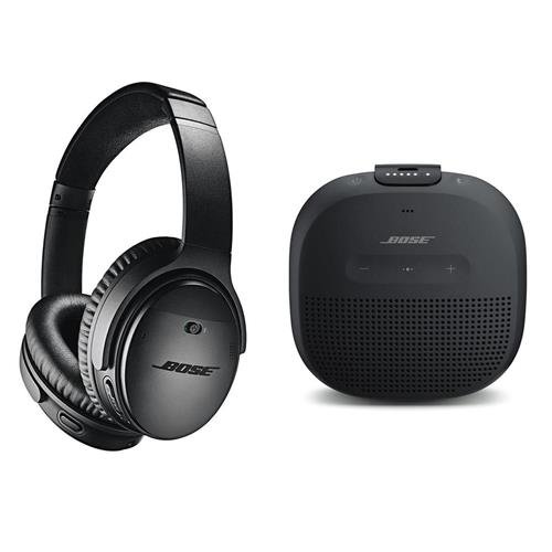 -. Feature : Bose QuietComfort 35 Wireless Headphones II with Microphone - 12" USB Charging Cable - 47.2" Audio Cable - Carrying Case - Airline Adapter - Bose 1 Year Limited Warranty - Bose SoundLink Micro Bluetooth Speaker, Single, Black / Material of Construction: Glass-filled nylon body, Alcantara covering, steel headband / Noise Cancellation: Active / NFC: Yes / Indicators: Battery, Bluetooth