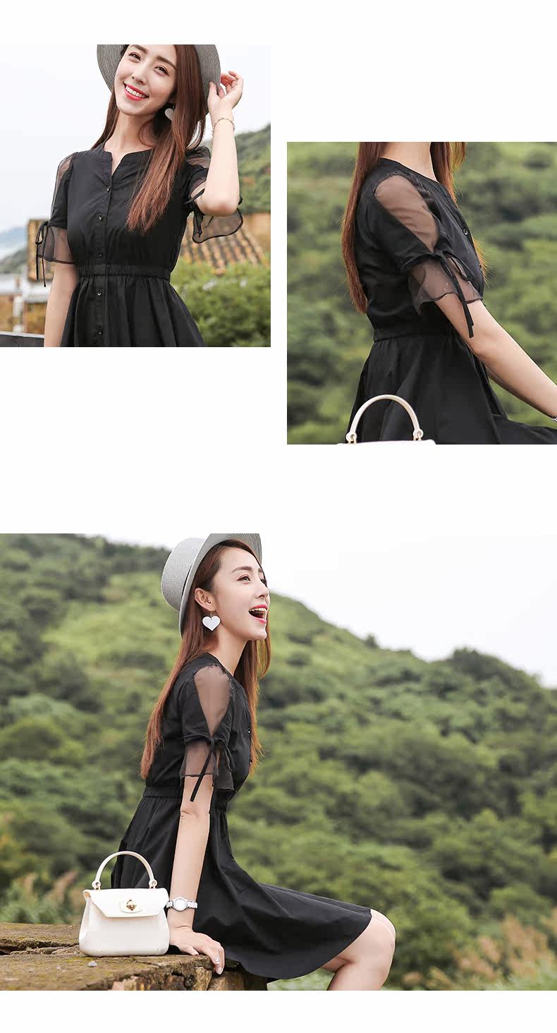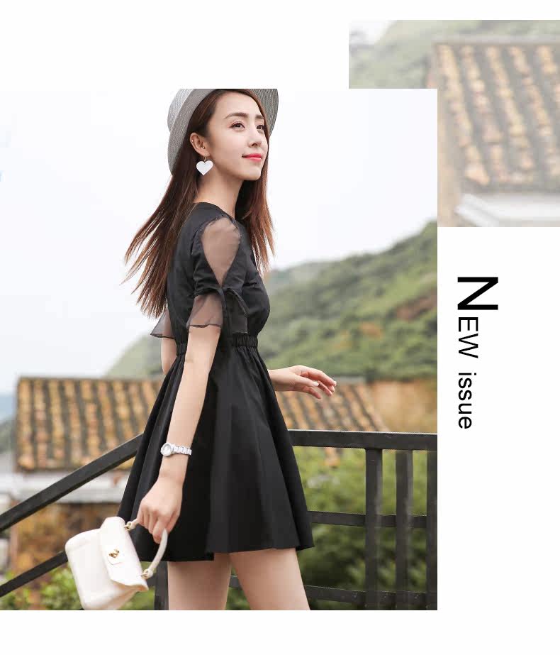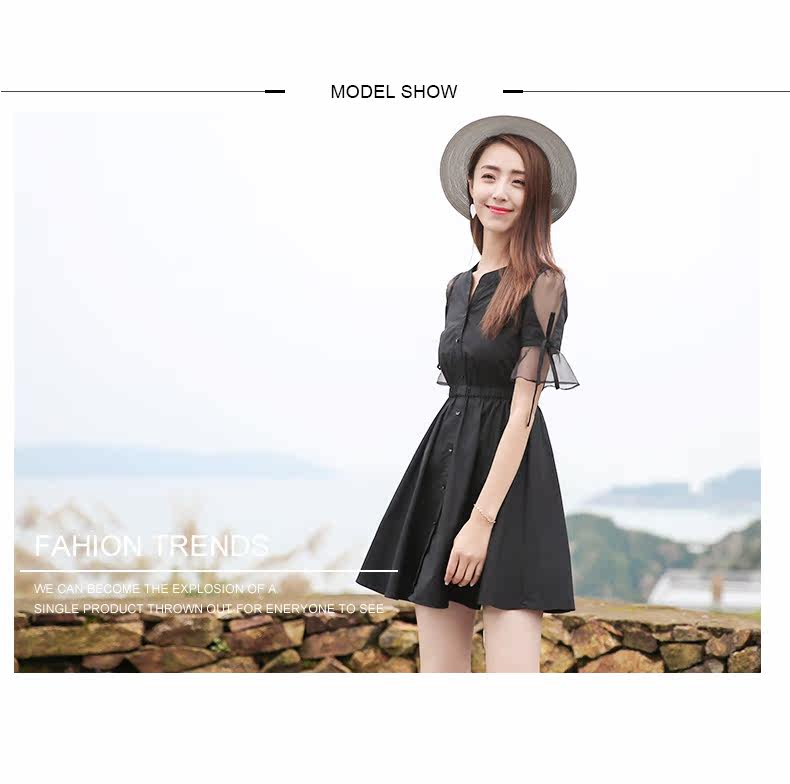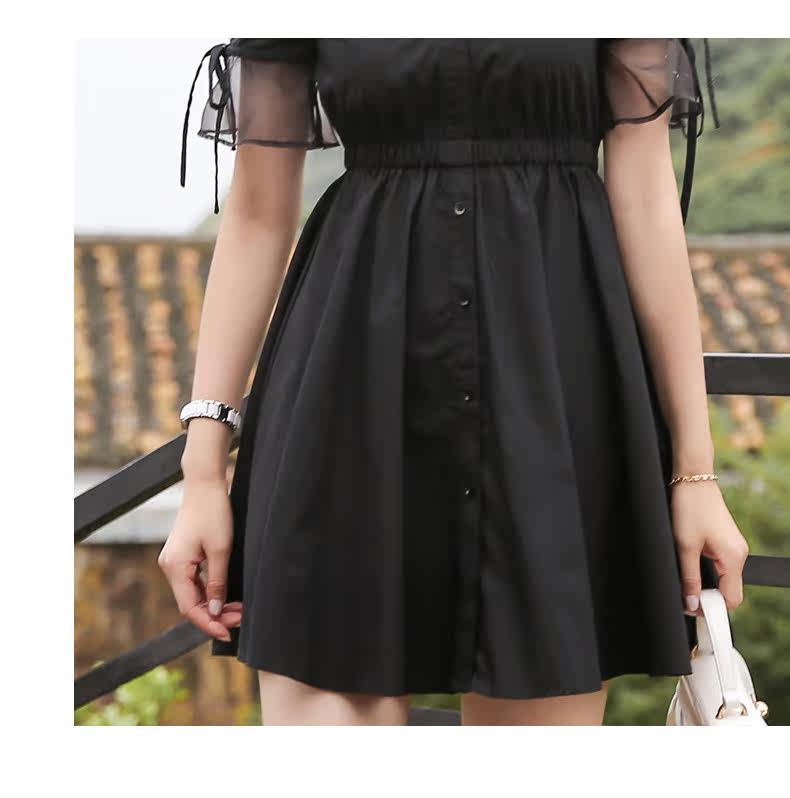夏季欧根纱性感透视小黑裙子 学院甜美风收腰显瘦A型连衣裙女