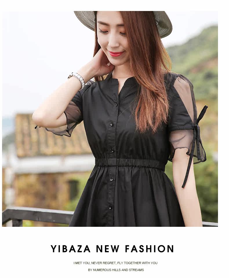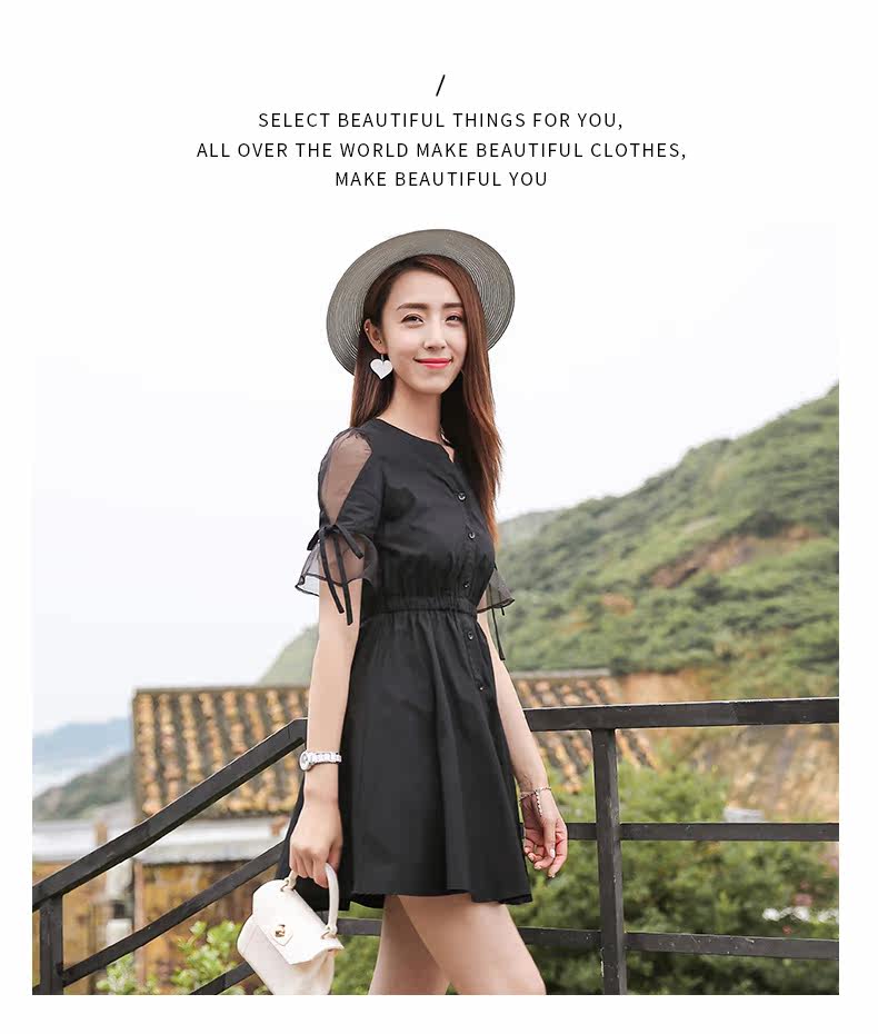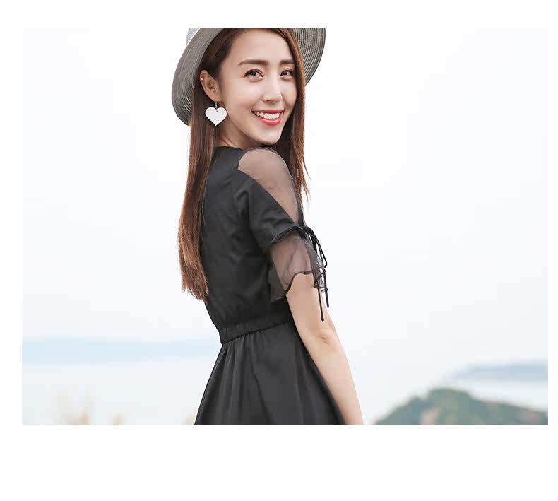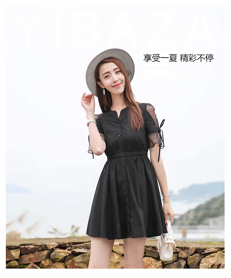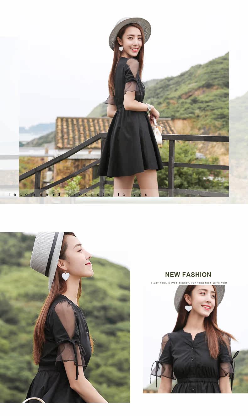 夏季欧根纱性感透视小黑裙子 学院甜美风收腰显瘦A型连衣裙女