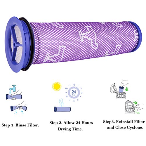 Washable and Reusable: The dyson dc41 &65 filter can be washed. Only use cool water to wash any of Dysons washable filters. Once the water run clean when washing the filter, gently squeeze any excess water from it and leave it out to dry for a full twenty four hours. . It is a good idea to have an extra filter to place back into your vacuum while the other one in drying.