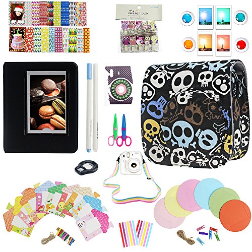 Elvam 12 in 1 Camera Accessory Bundles Set for Fujifilm Instax Mini 8 - Black Skull (Mini 8 Case/Camera Strap/Album/Film Frames/Stickers/Border Stickers/Lens/Filter/Owl Clip/Pens/Scissors)