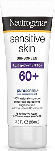 Dermatologist recommended. Sunblock Neutrogena Active Ingredients: Titanium Dioxide 4.98%; Zinc Oxide 4.81% Apply liberally and evenly to all exposed areas before sun exposure. Ensure complete coverage. Reapply as needed or after swimming, perspiring, towel drying or vigorous activity. Inactive Ingredients: Alumina; Arachidyl Alcohol; Arachidyl Glucoside; Ascorbic Acid; Beeswax; Behenyl Alcohol; Benzyl Alcohol; BHT; Bisabolol; Butylene Glycol; Butyloctyl Salicylate; Cetyl Dimethicone; Disodium EDTA; Ethylhexylglycerin; Glyceryl Stearate; Hydroxyethyl Acrylate/Sodium Acryloyldimethyl Taurate Copolymer; Isohexadecane; Methicone; Methylisothiazolinone; Pantothenic Acid; PEG-100 Stearate; PEG-8; Polyaminopropyl Biguanide; Polyhydroxystearic Acid; Polymethyl Methacrylate; Polysorbate 60; Retinyl Palmitate; Silica; Stearic Acid; Styrene/Acrylates Copolymer; Tocopheryl Acetate; Triethoxycaprylylsilane; Trimethylsiloxysilicate; Trisiloxane; Water; Xanthan Gum Uses: Neutrogena Sensitive Skin Sunblock Lotion SPF 60+ is a gentle oil-free formula that physically blocks the sun's damaging rays to provide instant protecton without irritating chemical sunscreens. Unique Purescreen provides superior broad-spectrum UVA/UVB protection with naturally-sourced sunscreen ingredients. Vanishes on skin for a weightless, non-greasy feel. Gentle enough for even the most sensitive skin. Waterproof, sweatproof. Hypoallergenic. Fragrance free. Oil free. Won't clog pores. PABA free. For external use only. Not to be swallowed. Avoid contact with eyes. Discontinue use if signs of irritation or rash appear. Use on children under 6 months of age only with the advice of a physician. Ask a doctor before use on children under 6 months of age. Keep this and all drugs out of reach of children. In case of accidental ingestion, seek professional assistance or contact a Poison Control Center immediately.Feature