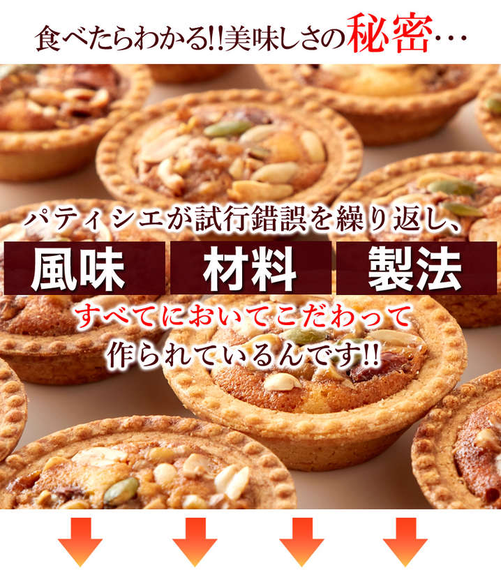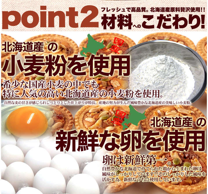 ●原材料:小麦粉(小麦(北海道産))、マーガリン、卵、砂糖、はちみつ、落花生(落花生、植物油、食塩)、アーモンドプードル(アーモンド、コーンスターチ)、くるみ、かぼちゃの種、アーモンド、乳化剤、香料、酸化防止剤(V.E)、アナトー色素(原材料の一部に大豆、卵、小麦、落花生、くるみを含む)