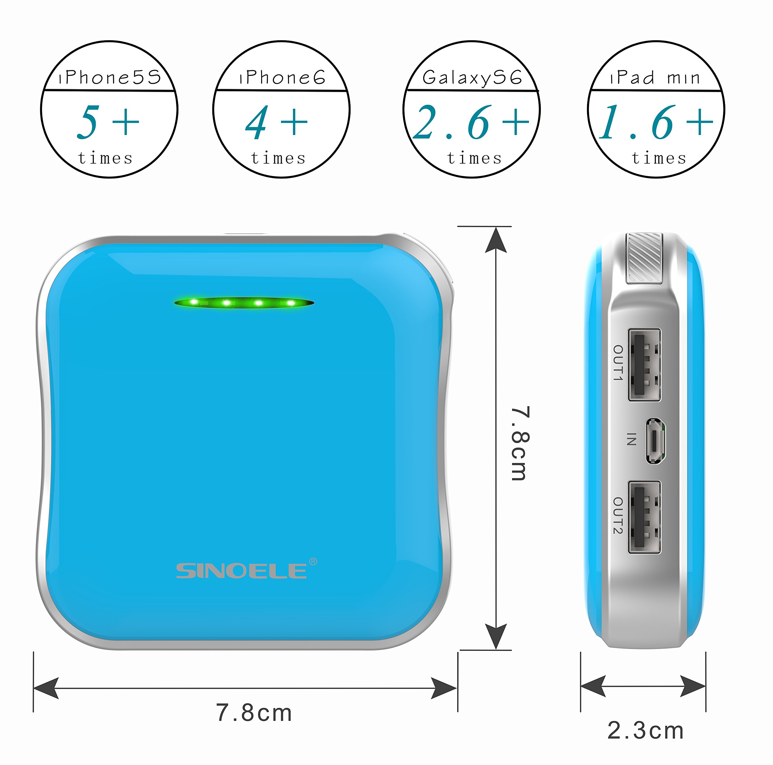 With 10000 mAh large capacity, 3 full charge to iPhone 6s, 2 full charge to Sumsung Glaxy S 7, 1 full charge to iPad Mini is possible.