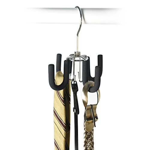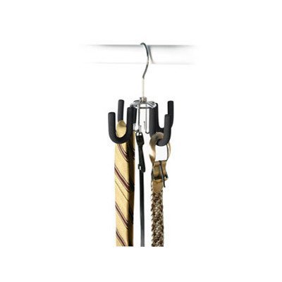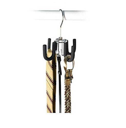 Studio : Richards Homewares Publisher : Richards Homewares Binding : Kitchen Product Description Stop using your garment hangers to hold your belts and ties! Organize your belt collection with this Black Friction Swivel Belt Hanger by Richards Homewares. The strong, chrome plated metal construction of this belt holder allows you to hang several of your belts in a neat and organized fashion. Place your belts on one of the four large and sturdy hooks protected by non-slip black friction material. The swivel belt hanger also features a hanging hook for placing in the closet or wardrobe. Without taking much space at all, your belts will hang neatly and conveniently from most closet rods where you can quickly and easily access your belts by this hanger's rotating mechanism. 0