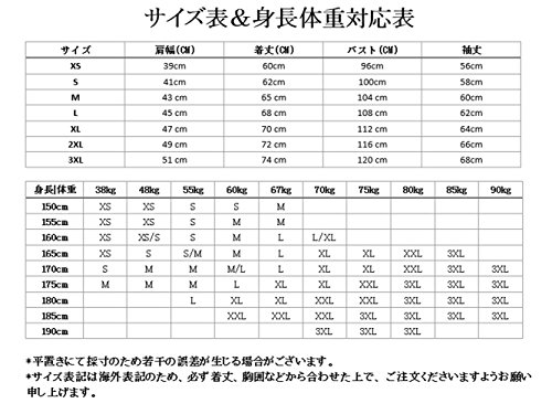 -. Feature : 【XSサイズ】:肩幅39cm 着丈60cm 袖丈56cmバスト96cm 身長範囲150-160cm 体重範囲40-45 kg / 【Sサイズ】:肩幅41cm 着丈62cm 袖丈58cm バスト100cm 身長範囲160-165cm 体重範囲45-50 kg / 【Mサイズ】:肩幅43cm 着丈65cm 袖丈60cm バスト104cm 身長範囲160-170cm 体重範囲50-55 kg / 【Lサイズ】:肩幅45cm 着丈68cm 袖丈62cm バスト108cm 身長範囲170-175cm 体重範囲55-60 kg / 【XLサイズ】:肩幅47cm 着丈70cm 袖丈64cm バスト112cm 身長範囲170-175cm  体重範囲60-70 kg 注意: サイズ選びは、ご購入の前に必ず商品説明または詳細写真にてご確認ください。詳しい情報は下の「商品の説明」をご覧ください。