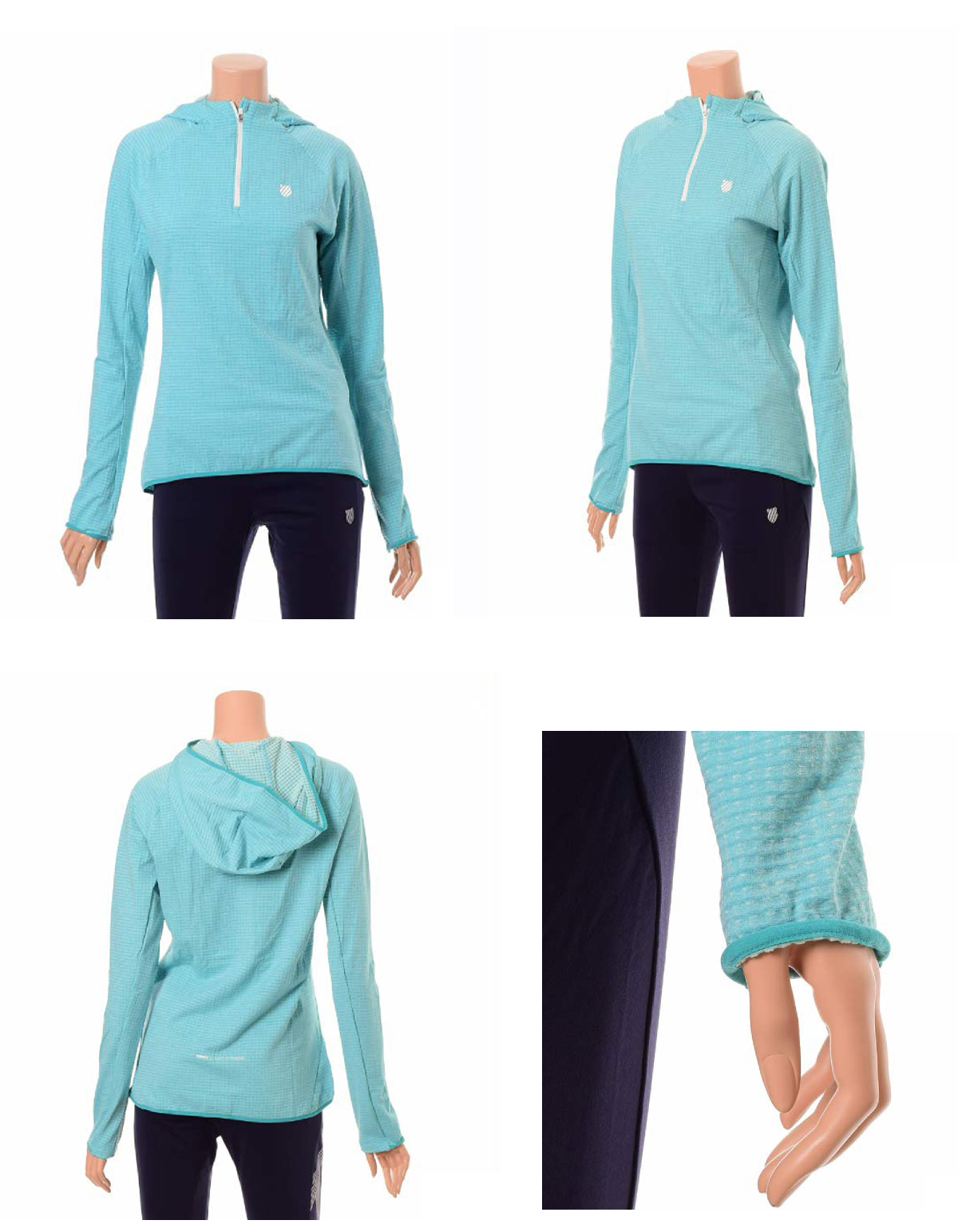 후드가 있어 겨울 외부 운동시 바람을 막아주고 허리라인에 절개를 주고 허리를 잡아주어 슬림해 보일수 있도록 디자인