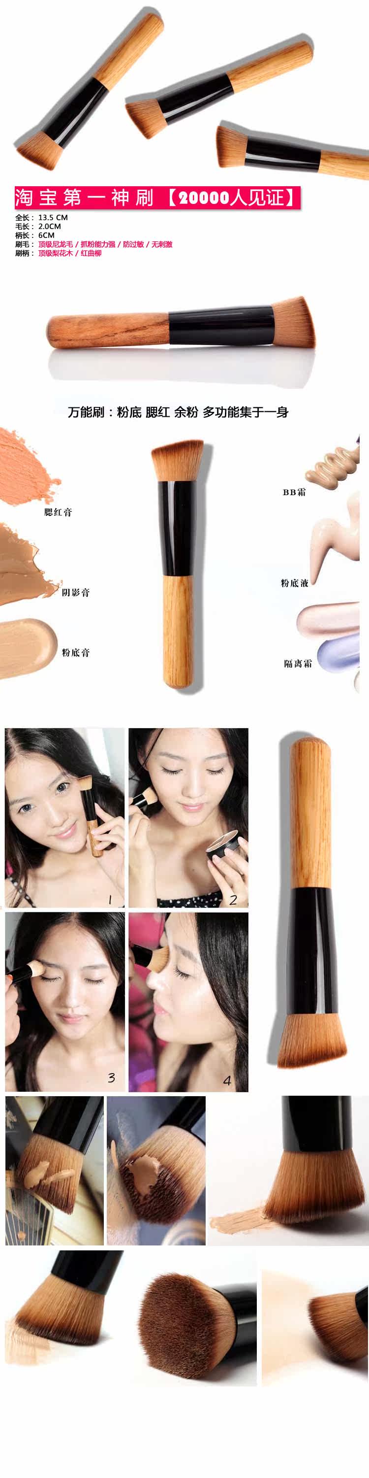| ·主要功效 | 1/配合粉底液 粉底膏 BB霜 隔离 2/配合干湿两用粉饼 干用粉饼 高光阴影粉 3/配合腮红膏 慕斯腮红,更多功能看等你开发 这就是一支全功能的刷 |