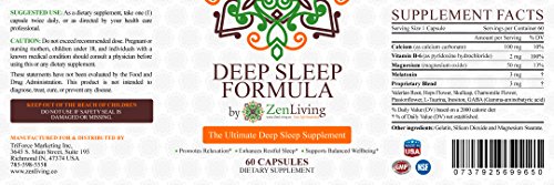 - Feature : SLEEP BETTER: Despite the negative effects of insufficient sleep, countless numbers of people still fail to get enough rest. The Deep Sleep Formula can change that: relaxes users and helps them fall asleep and sleep better. / DRUG FREE AND NON-HABIT FORMING : Unlike prescriptions supplements, The Deep Sleep Formula is composed with safe and natural ingredients that will enhance restful sleep without any undesired side effects / NATURAL INGREDIENTS: Including Valerian root, Hops flower, Passion flower and Chamomile, helping with the deepest sleep possible. / EASY TO USE: Each bottle contains 60 capsules. Simply take one capsule an hour before going to sleep to get a fantastic and peaceful sleep. / TRUSTED BRAND: At Zen Living, we always strive to bring high quality products to our consumers, and this is no exception. The Deep Sleep Formula contains pure ingredients that provide a safe and natural alternative to other sleep disorder remedies.